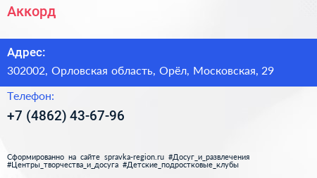 Аккорд по адресу 302002, Орловская область, Орёл, Московская, 29 в дальнейшем Организация, размещена в следующих категориях: