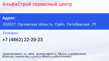 АльфаСтрой, сервисный центр по адресу 302027, Орловская область, Орёл, Октябрьская, 79 в дальнейшем Организация, размещена в следующих категориях: