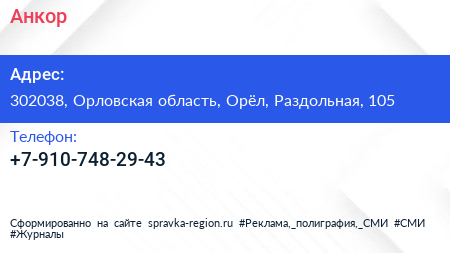 Анкор по адресу 302038, Орловская область, Орёл, Раздольная, 105 в дальнейшем Организация, размещена в следующих категориях: