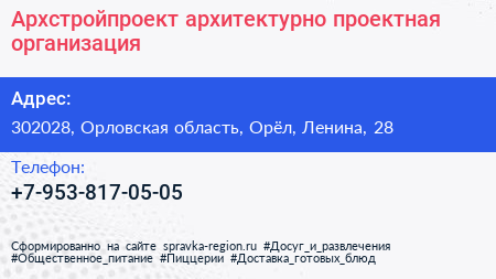 Архстройпроект, архитектурно-проектная организация по адресу 302028, Орловская область, Орёл, Ленина, 28 в дальнейшем Организация, размещена в следующих категориях: