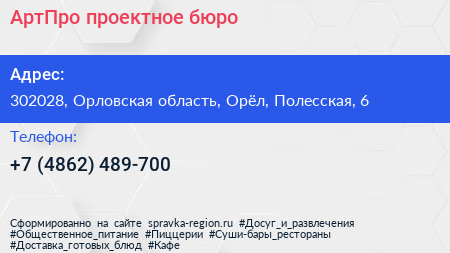 АртПро, проектное бюро по адресу 302028, Орловская область, Орёл, Полесская, 6 в дальнейшем Организация, размещена в следующих категориях: