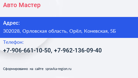 Авто Мастер по адресу 302028, Орловская область, Орёл, Коневская, 5Б в дальнейшем Организация, размещена в следующих категориях: