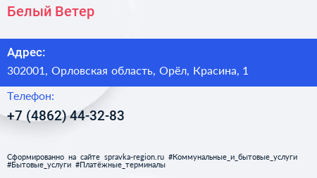 Белый Ветер по адресу 302001, Орловская область, Орёл, Красина, 1 в дальнейшем Организация, размещена в следующих категориях: