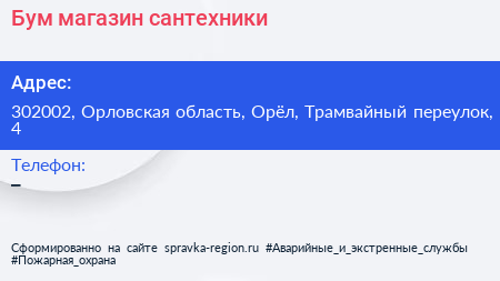 Бум, магазин сантехники по адресу 302002, Орловская область, Орёл, Трамвайный переулок, 4 в дальнейшем Организация, размещена в следующих категориях: