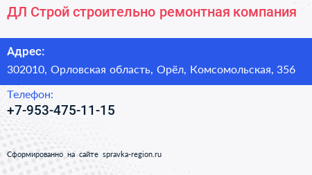 ДЛ-Строй, строительно-ремонтная компания по адресу 302010, Орловская область, Орёл, Комсомольская, 356 в дальнейшем Организация, размещена в следующих категориях:
