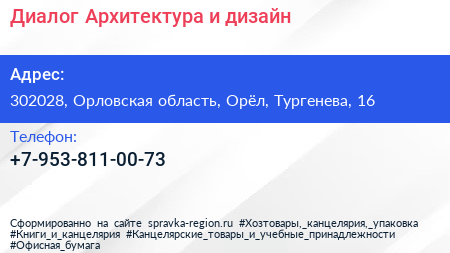 Диалог. Архитектура и дизайн по адресу 302028, Орловская область, Орёл, Тургенева, 16 в дальнейшем Организация, размещена в следующих категориях: