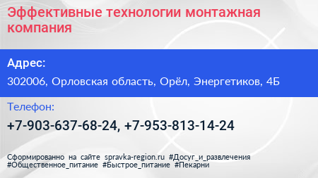 Эффективные технологии, монтажная компания по адресу 302006, Орловская область, Орёл, Энергетиков, 4Б в дальнейшем Организация, размещена в следующих категориях: