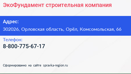 ЭкоФундамент, строительная компания по адресу 302026, Орловская область, Орёл, Комсомольская, 66 в дальнейшем Организация, размещена в следующих категориях: