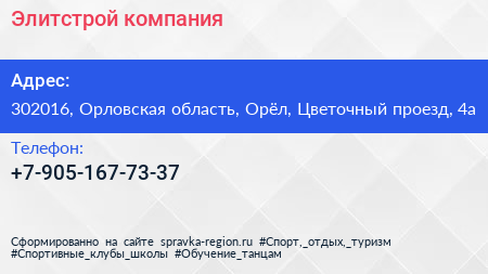 Элитстрой, компания по адресу 302016, Орловская область, Орёл, Цветочный проезд, 4а в дальнейшем Организация, размещена в следующих категориях: