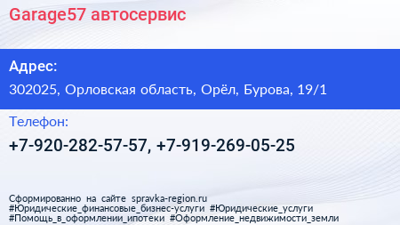 Garage57, автосервис по адресу 302025, Орловская область, Орёл, Бурова, 19/1 в дальнейшем Организация, размещена в следующих категориях: