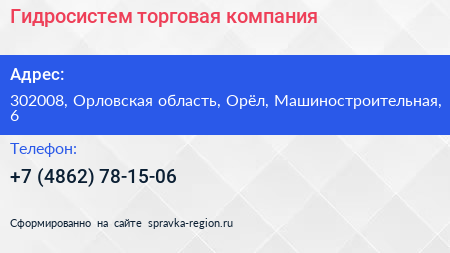 Гидросистем, торговая компания по адресу 302008, Орловская область, Орёл, Машиностроительная, 6 в дальнейшем Организация, размещена в следующих категориях: