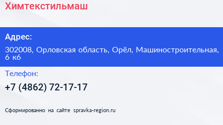 Химтекстильмаш по адресу 302008, Орловская область, Орёл, Машиностроительная, 6 к6 в дальнейшем Организация, размещена в следующих категориях: