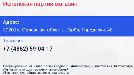 Испанская партия, магазин по адресу 302016, Орловская область, Орёл, Городская, 48 в дальнейшем Организация, размещена в следующих категориях:
