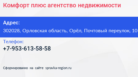 Комфорт плюс, агентство недвижимости по адресу 302028, Орловская область, Орёл, Почтовый переулок, 10 в дальнейшем Организация, размещена в следующих категориях: