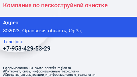 Компания по пескоструйной очистке по адресу 302023, Орловская область, Орёл, в дальнейшем Организация, размещена в следующих категориях: