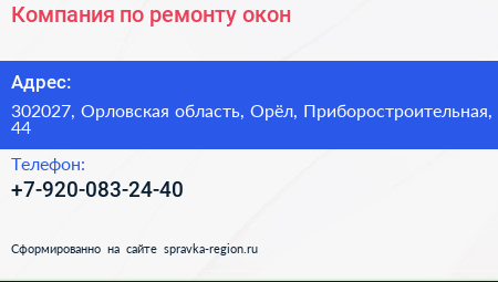 Компания по ремонту окон по адресу 302027, Орловская область, Орёл, Приборостроительная, 44 в дальнейшем Организация, размещена в следующих категориях:
