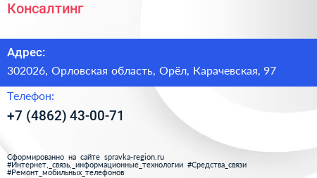 Консалтинг по адресу 302026, Орловская область, Орёл, Карачевская, 97 в дальнейшем Организация, размещена в следующих категориях: