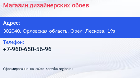 Магазин дизайнерских обоев по адресу 302040, Орловская область, Орёл, Лескова, 19а в дальнейшем Организация, размещена в следующих категориях: