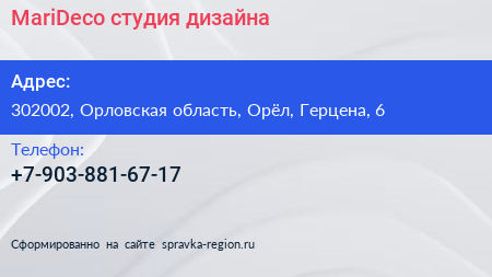 MariDeco, студия дизайна по адресу 302002, Орловская область, Орёл, Герцена, 6 в дальнейшем Организация, размещена в следующих категориях: