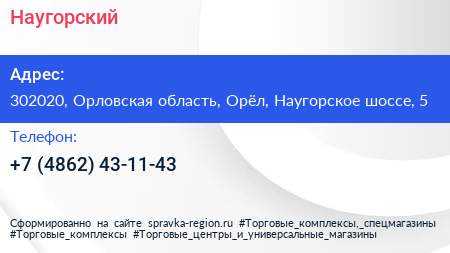 Наугорский по адресу 302020, Орловская область, Орёл, Наугорское шоссе, 5 в дальнейшем Организация, размещена в следующих категориях: