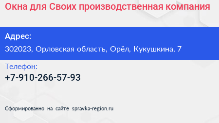 Окна для Своих, производственная компания по адресу 302023, Орловская область, Орёл, Кукушкина, 7 в дальнейшем Организация, размещена в следующих категориях: