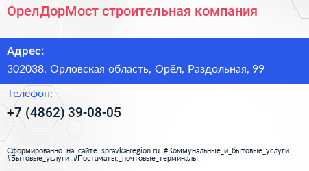 ОрелДорМост, строительная компания по адресу 302038, Орловская область, Орёл, Раздольная, 99 в дальнейшем Организация, размещена в следующих категориях: