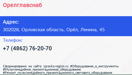 Орелглавснаб по адресу 302028, Орловская область, Орёл, Ленина, 45 в дальнейшем Организация, размещена в следующих категориях: