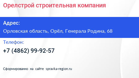 Орелстрой, строительная компания по адресу Орловская область, Орёл, Генерала Родина, 68 в дальнейшем Организация, размещена в следующих категориях: