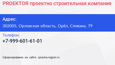 PROEKTOR, проектно-строительная компания по адресу 302005, Орловская область, Орёл, Спивака, 79 в дальнейшем Организация, размещена в следующих категориях: