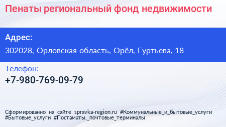 Пенаты, региональный фонд недвижимости по адресу 302028, Орловская область, Орёл, Гуртьева, 18 в дальнейшем Организация, размещена в следующих категориях: