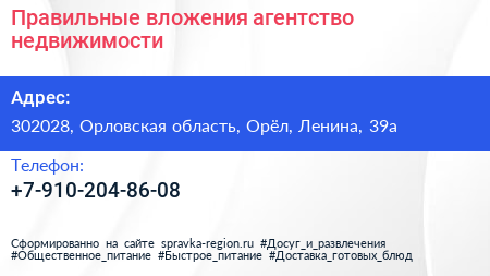 Правильные вложения, агентство недвижимости по адресу 302028, Орловская область, Орёл, Ленина, 39а в дальнейшем Организация, размещена в следующих категориях: