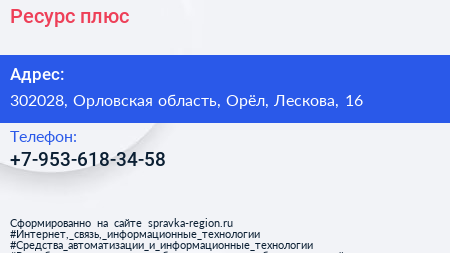 Ресурс-плюс по адресу 302028, Орловская область, Орёл, Лескова, 16 в дальнейшем Организация, размещена в следующих категориях:
