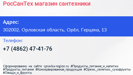 РосСанТех, магазин сантехники по адресу 302002, Орловская область, Орёл, Герцена, 13 в дальнейшем Организация, размещена в следующих категориях: