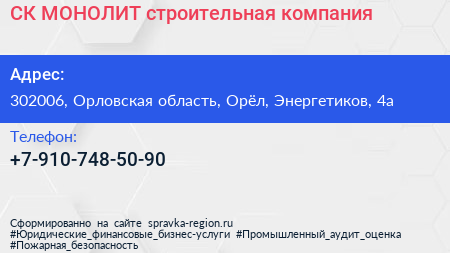 СК МОНОЛИТ, строительная компания по адресу 302006, Орловская область, Орёл, Энергетиков, 4а в дальнейшем Организация, размещена в следующих категориях: