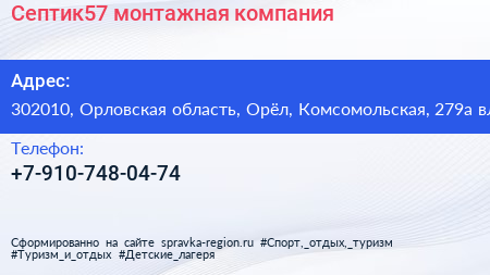 Септик57, монтажная компания по адресу 302010, Орловская область, Орёл, Комсомольская, 279а вл в дальнейшем Организация, размещена в следующих категориях:
