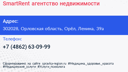 SmartRent, агентство недвижимости по адресу 302028, Орловская область, Орёл, Ленина, 39а в дальнейшем Организация, размещена в следующих категориях: