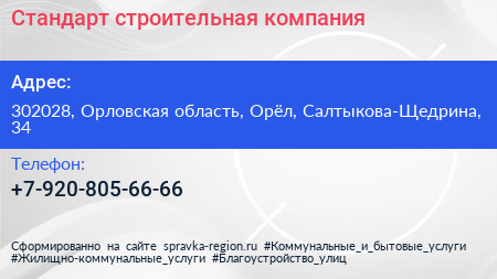 Стандарт, строительная компания по адресу 302028, Орловская область, Орёл, Салтыкова-Щедрина, 34 в дальнейшем Организация, размещена в следующих категориях: