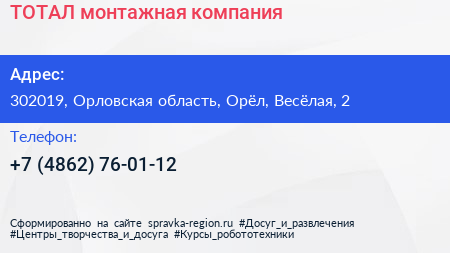 ТОТАЛ, монтажная компания по адресу 302019, Орловская область, Орёл, Весёлая, 2 в дальнейшем Организация, размещена в следующих категориях: