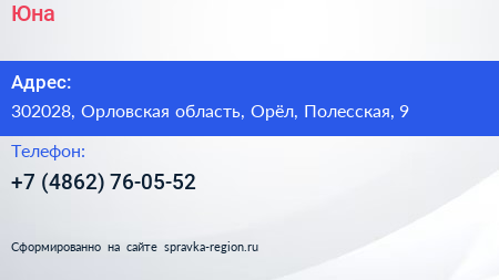 Юна по адресу 302028, Орловская область, Орёл, Полесская, 9 в дальнейшем Организация, размещена в следующих категориях: