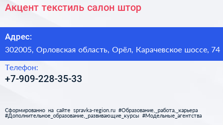 Акцент текстиль, салон штор по адресу 302005, Орловская область, Орёл, Карачевское шоссе, 74 в дальнейшем Организация, размещена в следующих категориях: