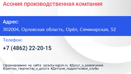 Асония, производственная компания по адресу 302004, Орловская область, Орёл, Семинарская, 52 в дальнейшем Организация, размещена в следующих категориях: