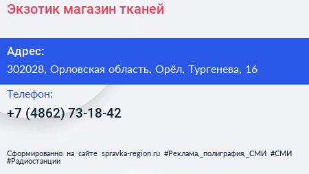 Экзотик, магазин тканей по адресу 302028, Орловская область, Орёл, Тургенева, 16 в дальнейшем Организация, размещена в следующих категориях: