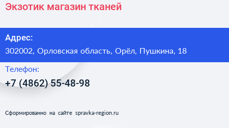 Экзотик, магазин тканей по адресу 302002, Орловская область, Орёл, Пушкина, 18 в дальнейшем Организация, размещена в следующих категориях: