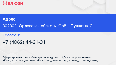 Жалюзи+ по адресу 302002, Орловская область, Орёл, Пушкина, 24 в дальнейшем Организация, размещена в следующих категориях: