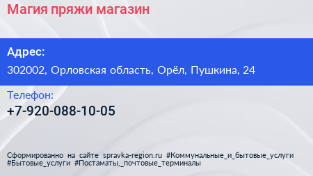Магия пряжи, магазин по адресу 302002, Орловская область, Орёл, Пушкина, 24 в дальнейшем Организация, размещена в следующих категориях: