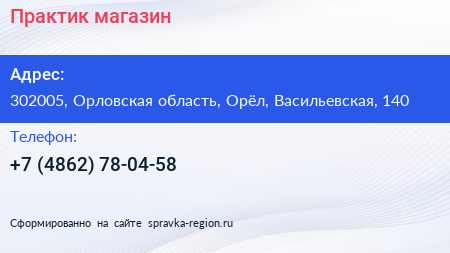 Практик, магазин по адресу 302005, Орловская область, Орёл, Васильевская, 140 в дальнейшем Организация, размещена в следующих категориях: