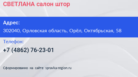 СВЕТЛАНА, салон штор по адресу 302040, Орловская область, Орёл, Октябрьская, 58 в дальнейшем Организация, размещена в следующих категориях: