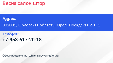Весна, салон штор по адресу 302001, Орловская область, Орёл, Посадская 2-я, 1 в дальнейшем Организация, размещена в следующих категориях: