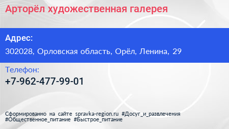 Арторёл, художественная галерея по адресу 302028, Орловская область, Орёл, Ленина, 29 в дальнейшем Организация, размещена в следующих категориях: