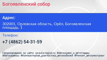 Богоявленский собор по адресу 302001, Орловская область, Орёл, Богоявленская площадь, 1 в дальнейшем Организация, размещена в следующих категориях: